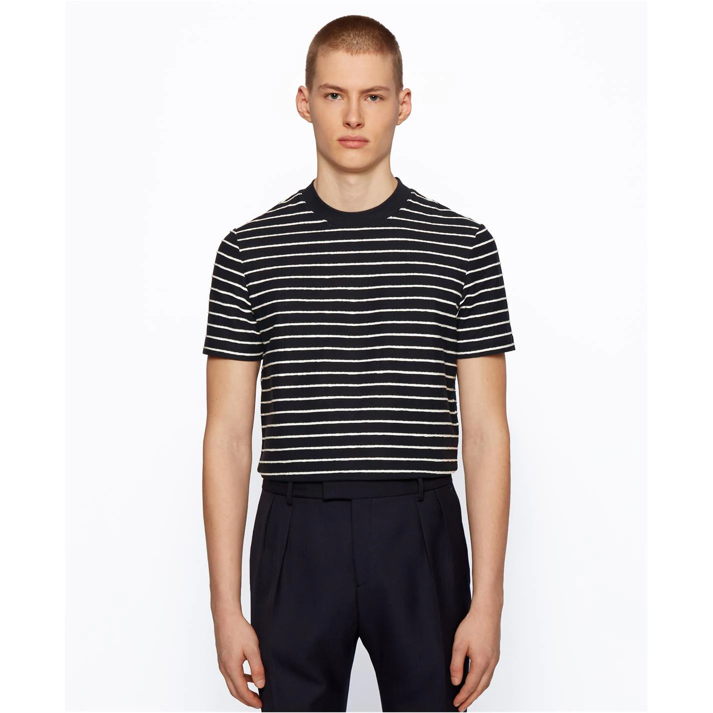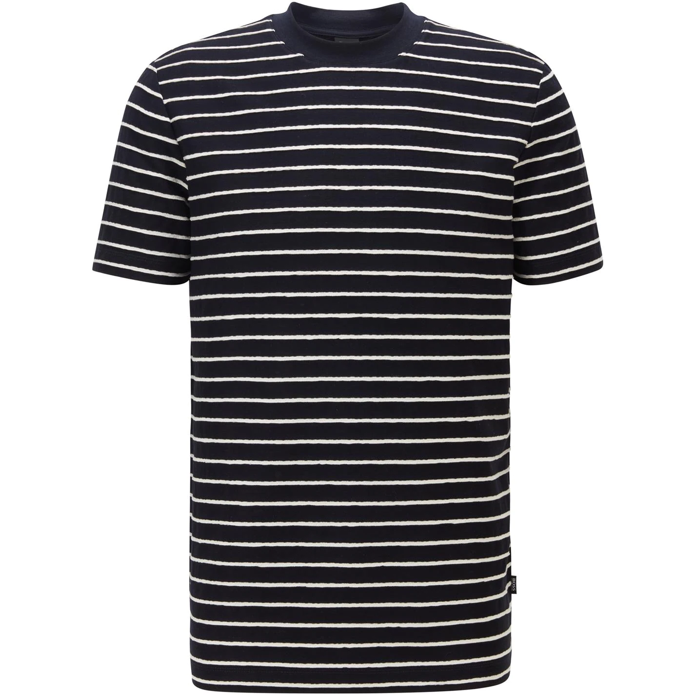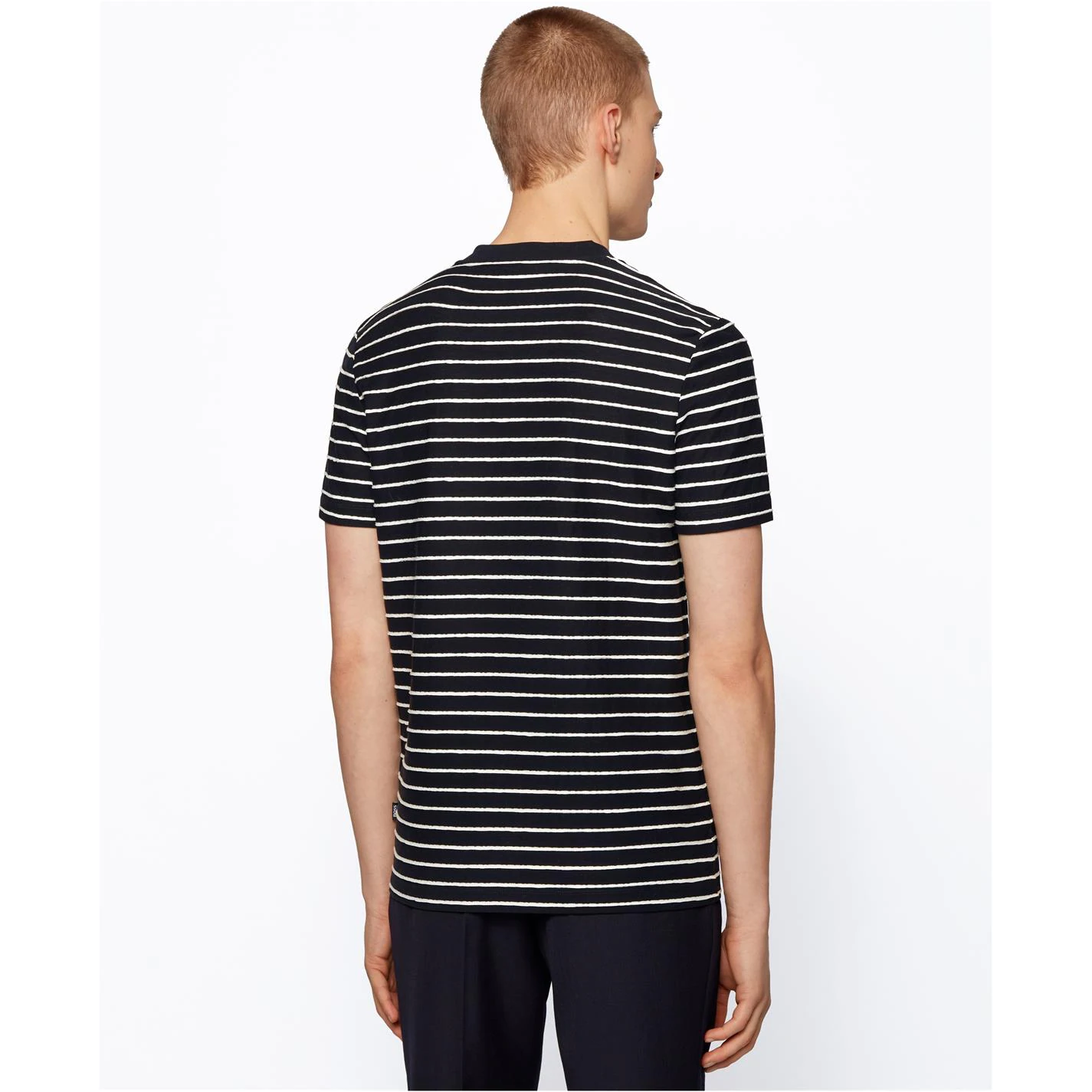 Enhance your collection with this BOSS Tiburt 223 T Shirt. Constructed with short sleeves and a ribbed crew neckline for a classic look, it features elasticated hems for a comfortable fit. This t shirt is a stripe design with the signature logo printed across the chest and is complete with BOSS branding.