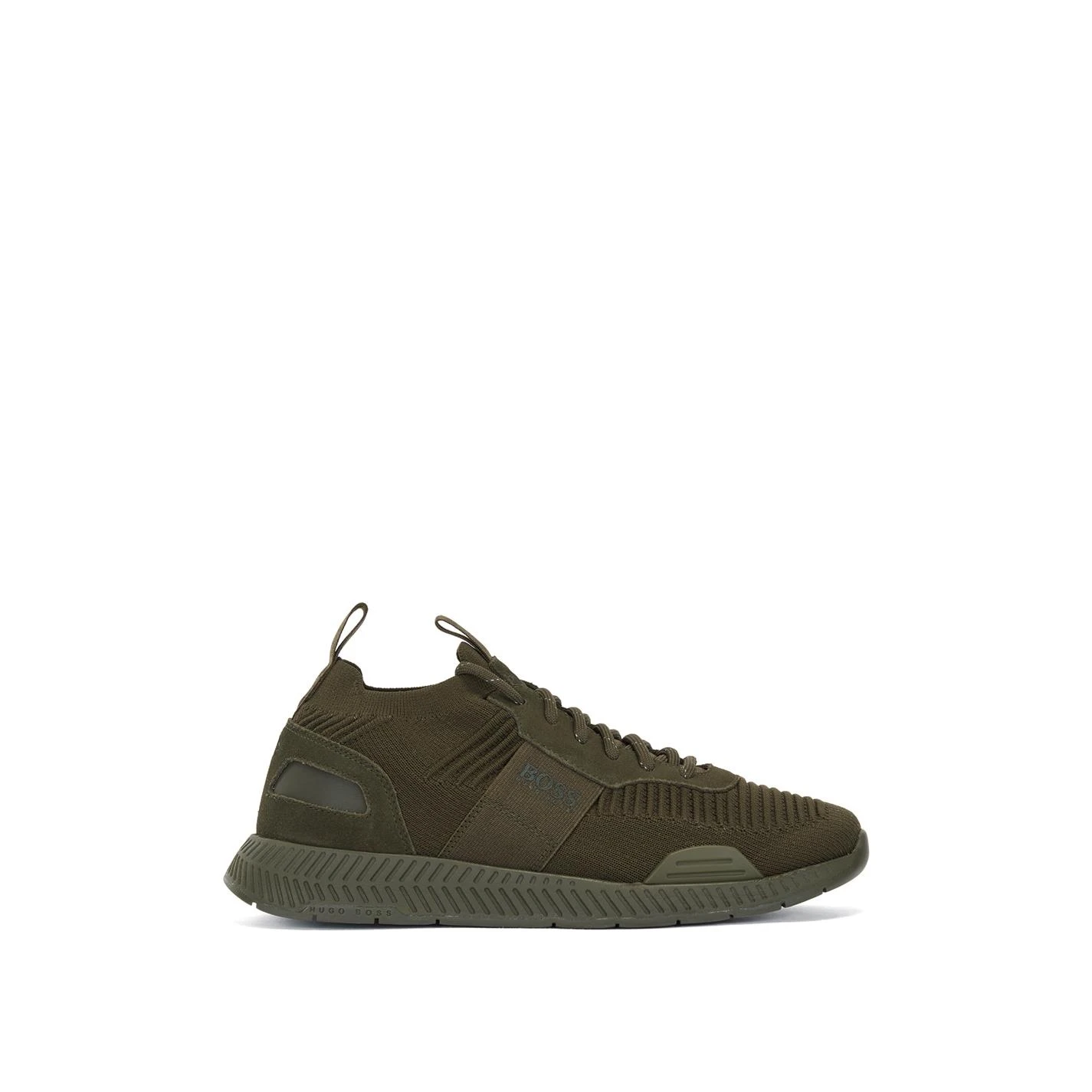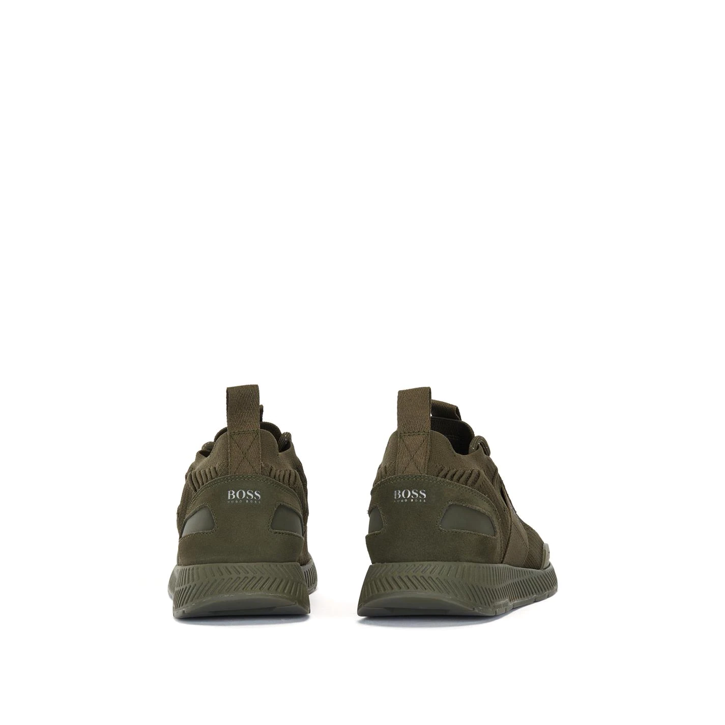 The Boss Titanium Knit Trainers are a great addition to your casual wardrobe, crafted with a low cut ankle collar, teamed with a lace fastening and a cushioned insole and midsole for a comfortable fit. Synthetic panel detail top the upper along with tonal stitching and the Boss branding complete the casual look.