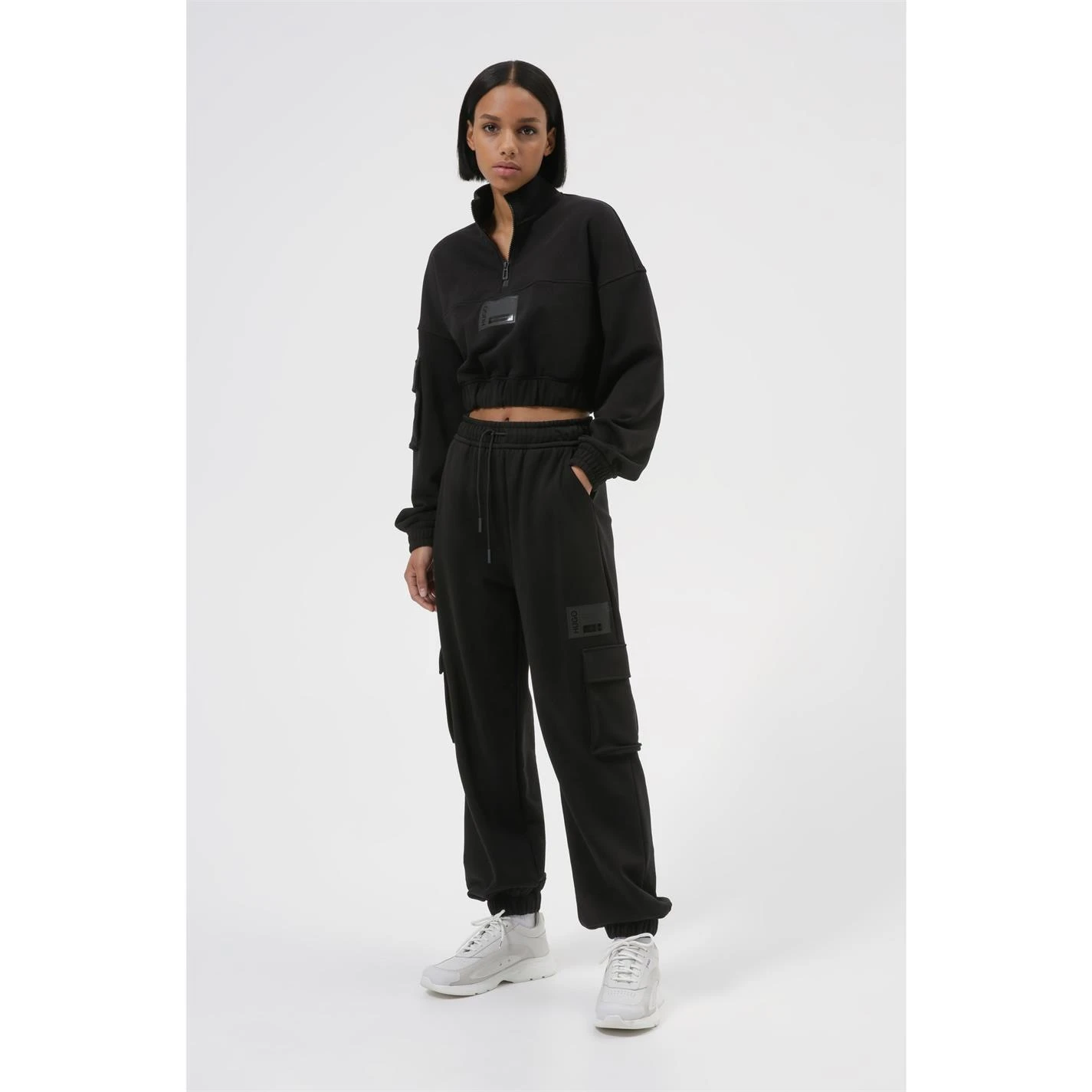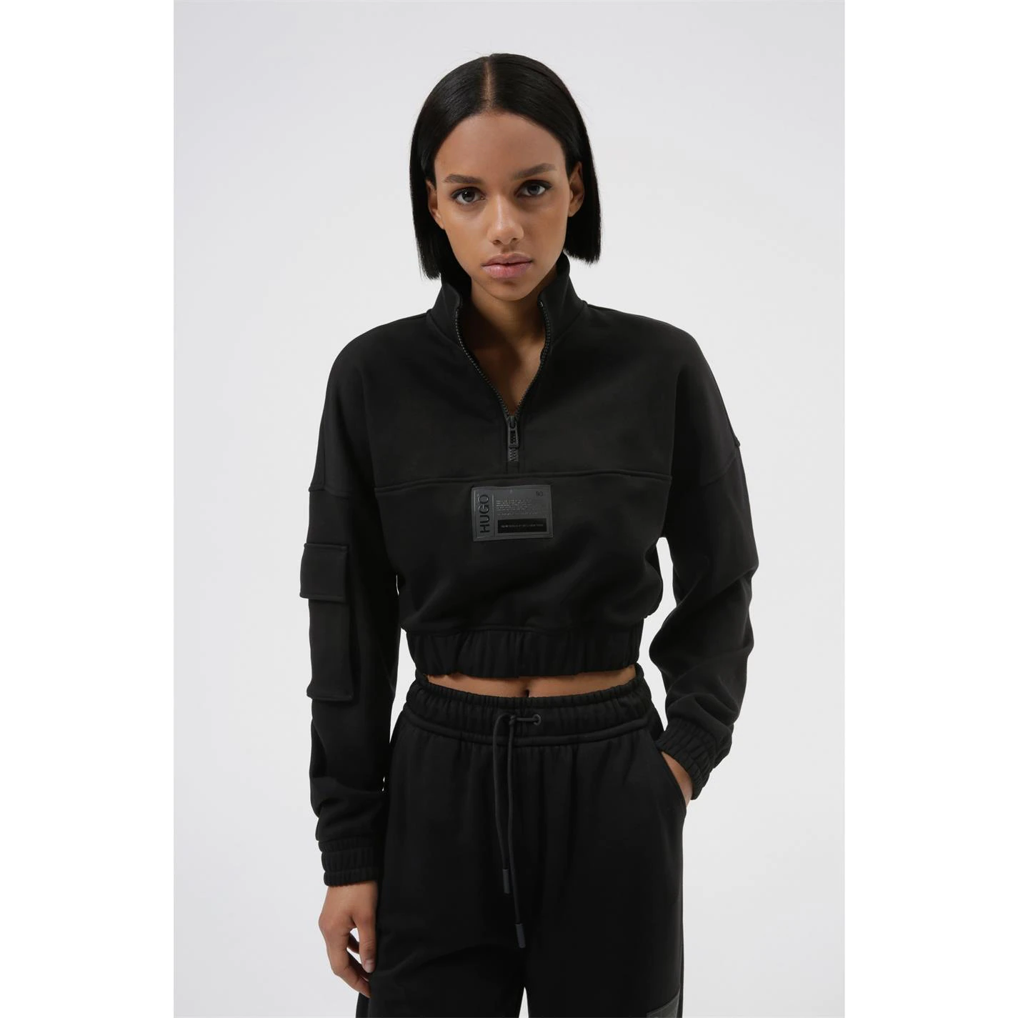 Elevate your collection with this HUGO Davara Zip Crop Sweatshirt. Crafted with half zip fastening and long sleeves for a classic look, it features a sleeve pocket for small possession storage. This sweatshirt is designed with a signature logo and is complete with HUGO branding.