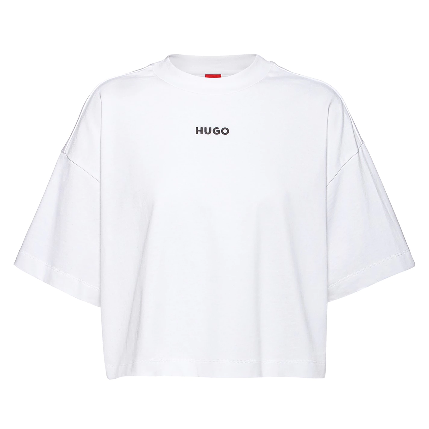 Stay stylish and conscious with the Hugo Daylora Crop Top. This piece has been made using at least 60% certified organic cotton with the dropped shoulders and cropped fit offering a contemporary style. Featuring a minimalist vibe for versatility, the solid block colouring leaves all eyes on the Hugo branding at the chest for a high quality appeal.