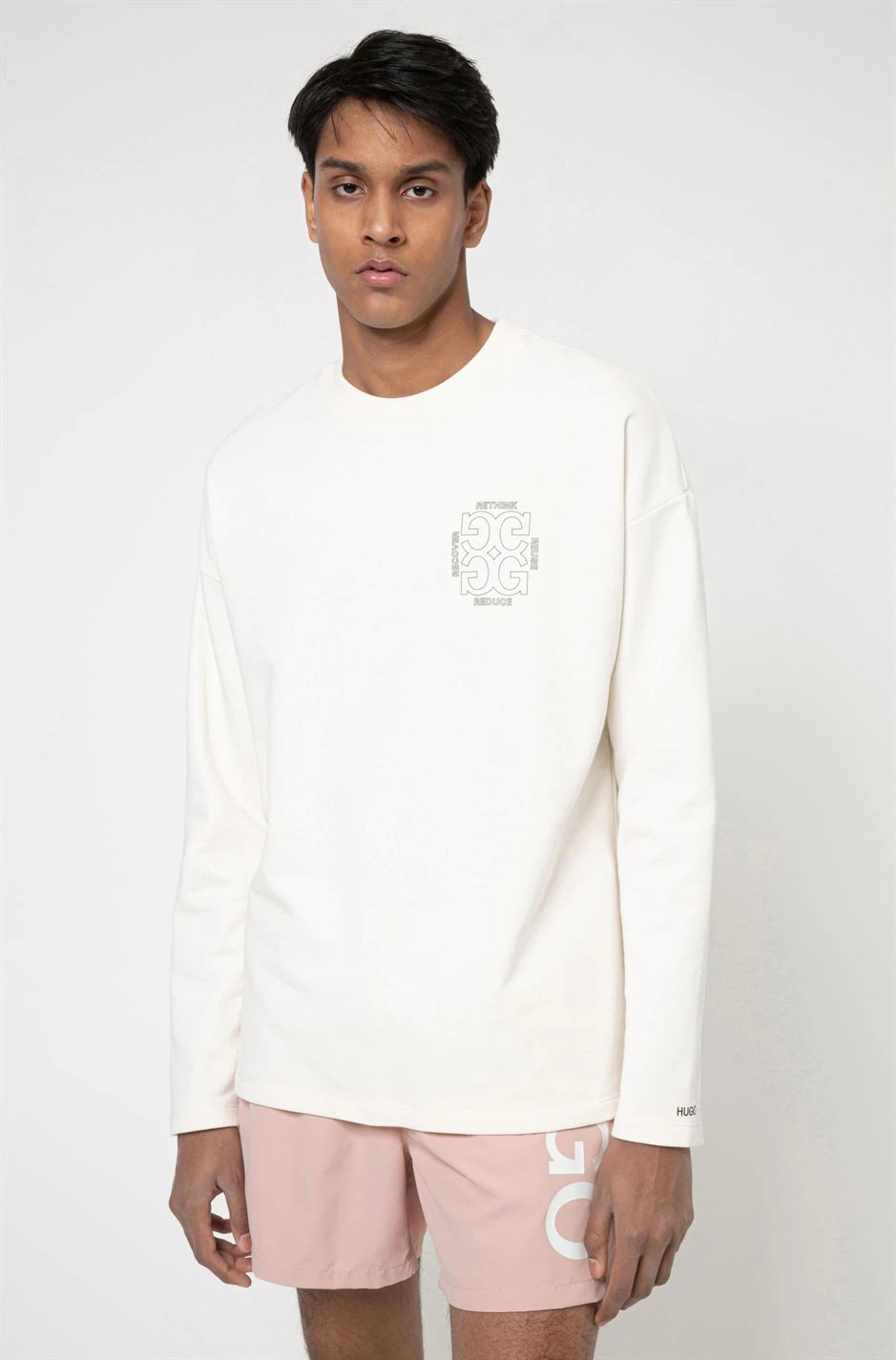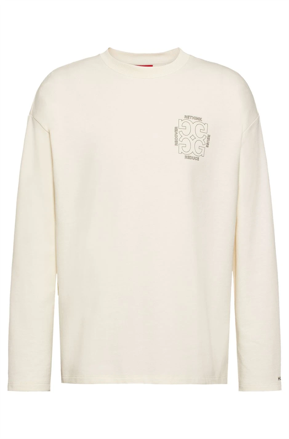 Refresh your collection with this HUGO Denesis Long Sleeve T Shirt. Constructed with long sleeves and a ribbed crew neckline for a classic look, it features elasticated hems for a comfortable fit. This t shirt is designed with a signature logo and is complete with HUGO branding.