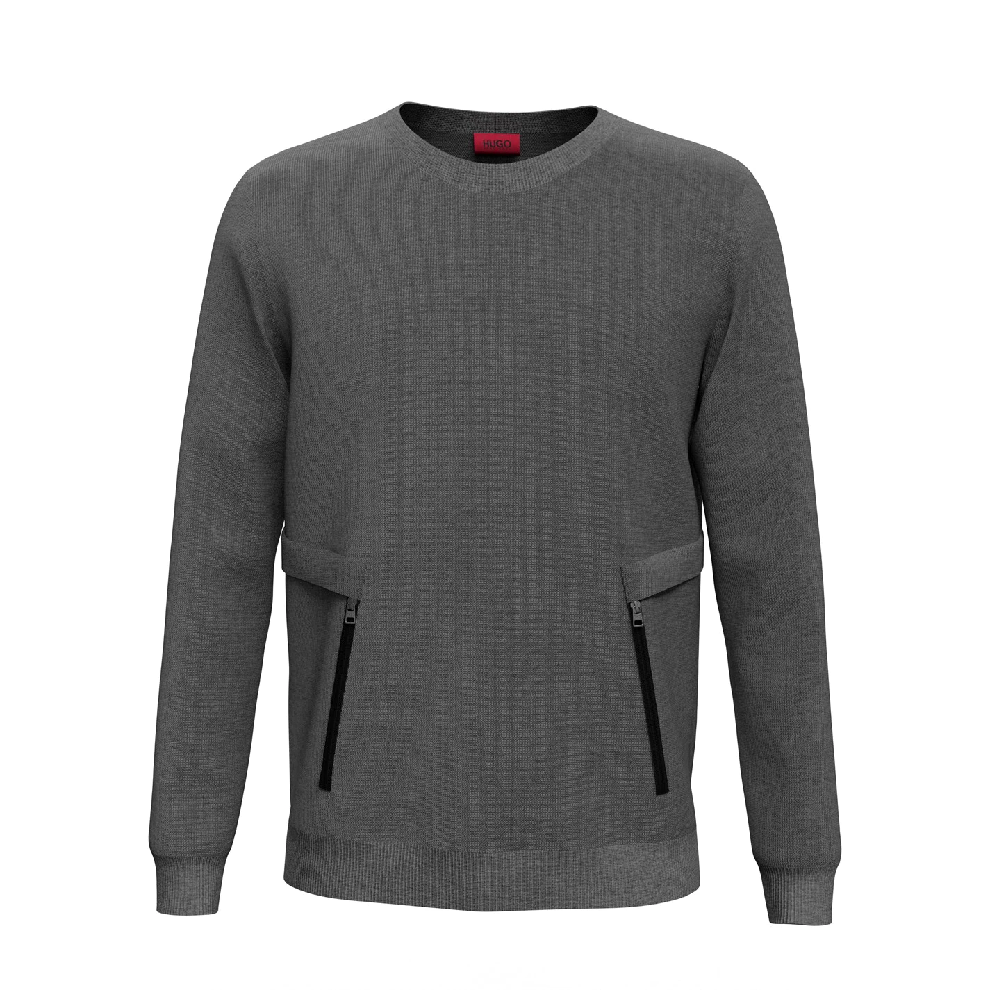 Enhance your collection with this HUGO Dyann Sweater. Constructed with a ribbed crew neckline and long sleeves for a classic look, it features comfortable elasticated hems and two zipped hand pockets for secure storage. This sweater is a solid colouring throughout designed with a signature logo and is complete with HUGO branding.