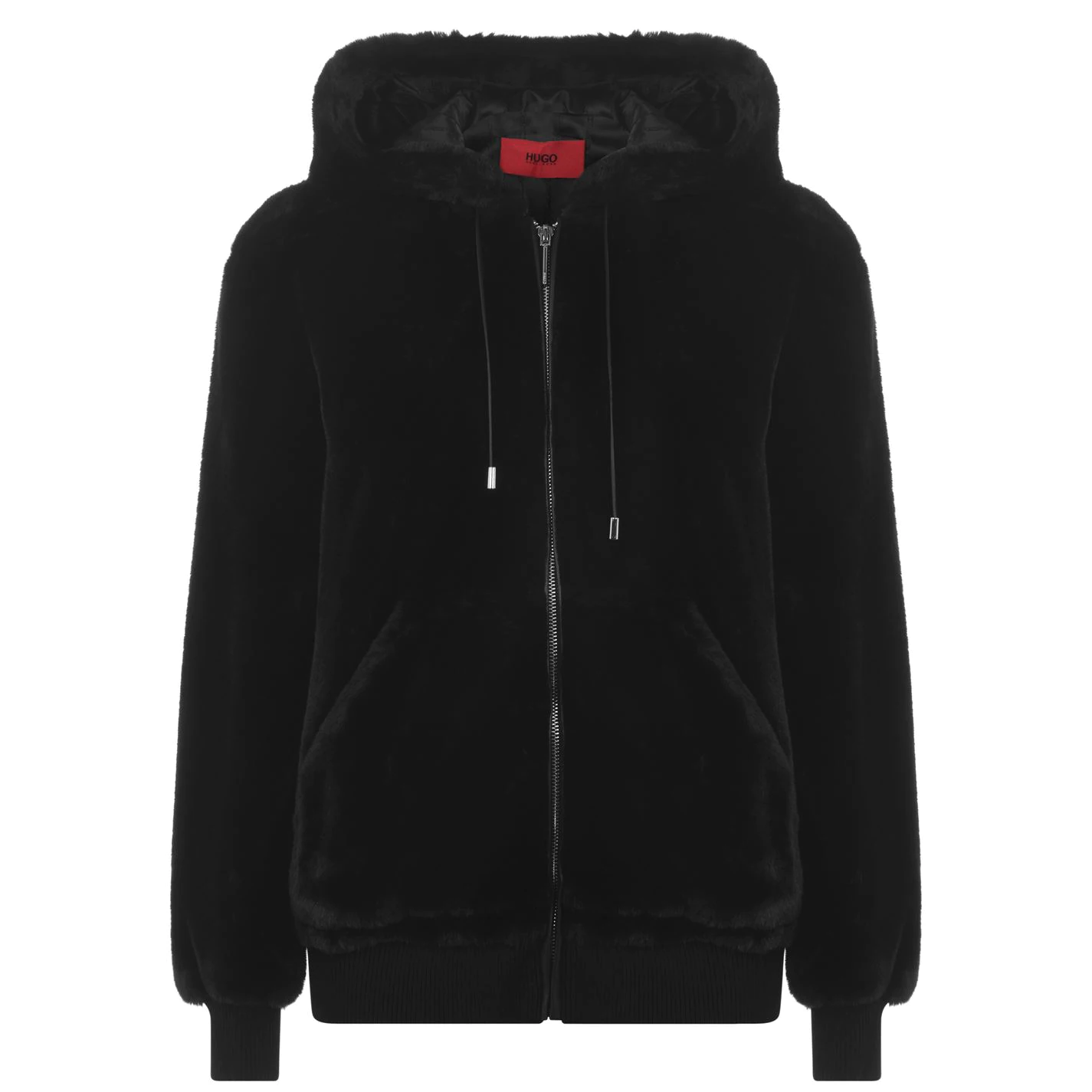 Wrap up during the cooler months in this Hugo Fionas 1 Fur Bomber Jacket. Constructed with a soft touch faux-fur outer, this jacket is crafted with a central zip fastening leading to a drawstring hood. Boasting two hand pockets and ribbed trims throughout for precise fit, the look is complete with Hugo branding for a designer touch.