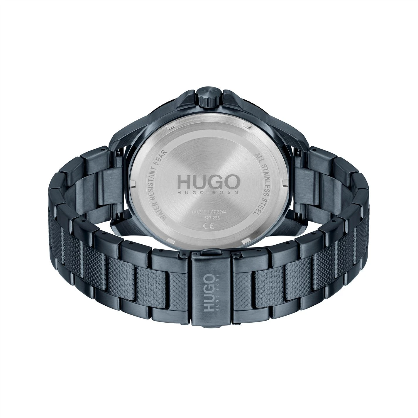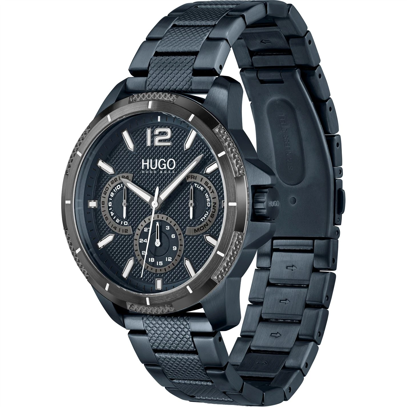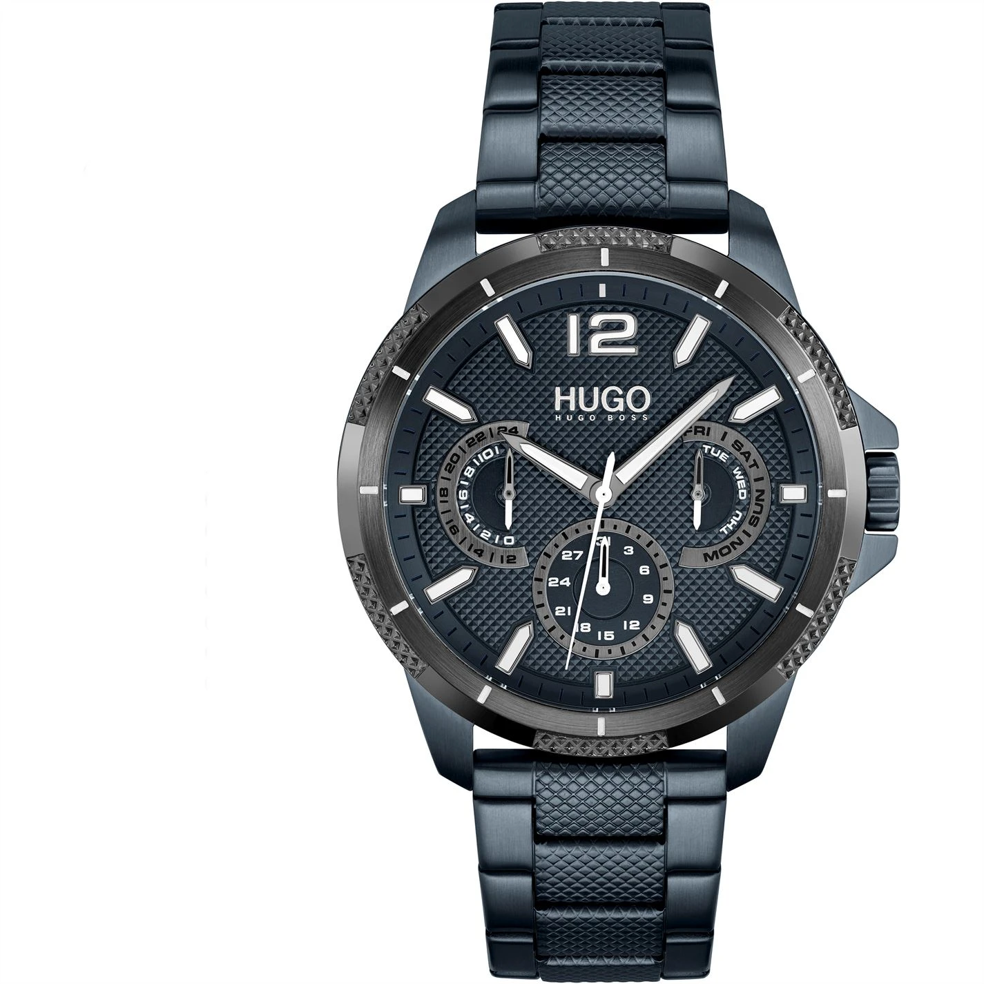 HUGO gents watch from the #SPORT family. Features 46mm blue IP stainless steel case with grey bezel, blue dial and blue IP stainless steel bracelet. Water resistant to 5ATM