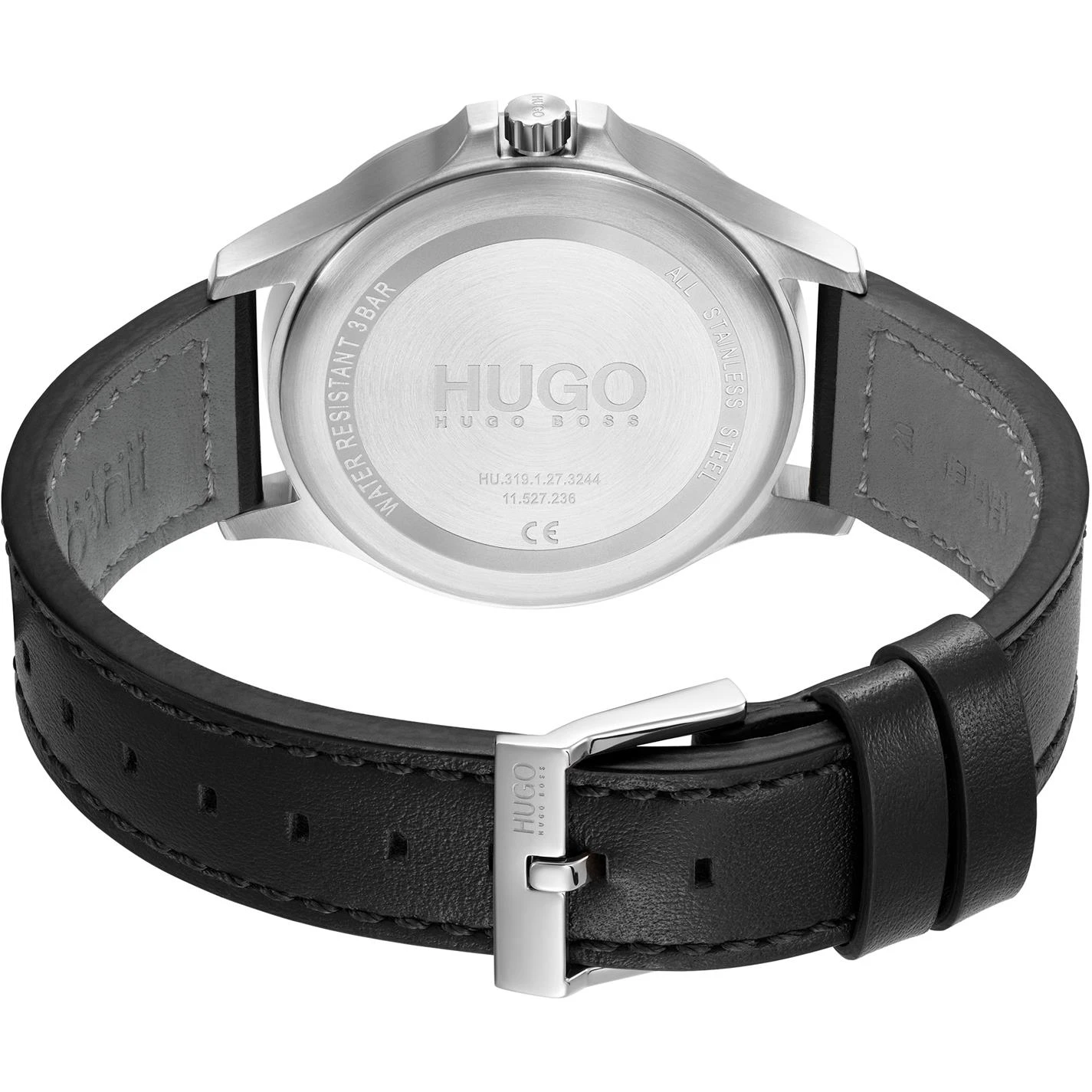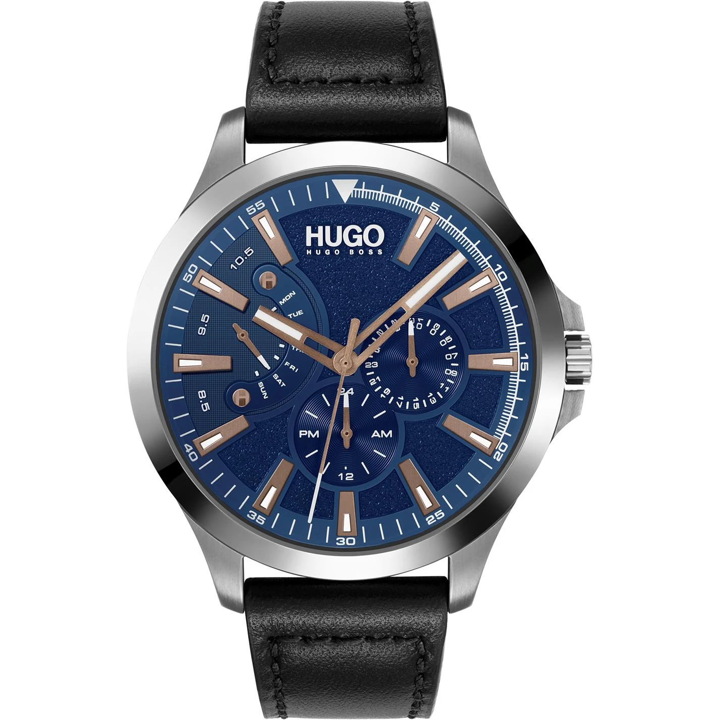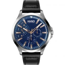To leap is to live. Inspired by the risk-taking approach of the HUGO man, the #LEAP collection is made up of bold, multifunction timepieces. An attention-grabbing fusion of multiple design elements, featuring a 45mm stainless steel case blue textured dial and black leather strap. Water resistant to 3ATM.