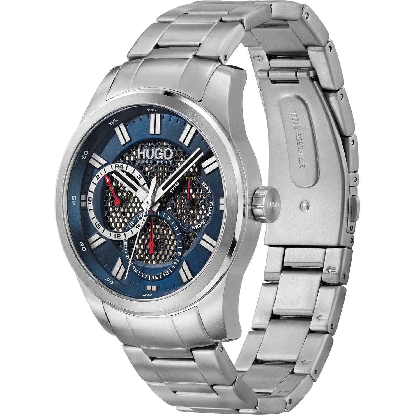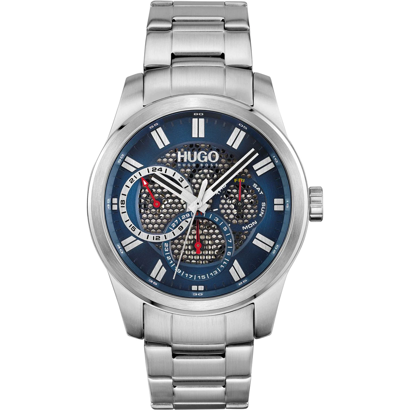 Combining a sporty aesthetic with a modern fine-grain dial that partially reveals the inner workings of the watch, the #SKELETON from HUGO Watches is a statement-making contemporary design. Features 44mm stainless steel case, blue textured dial and stainless steel bracelet. Water resistant to 5ATM