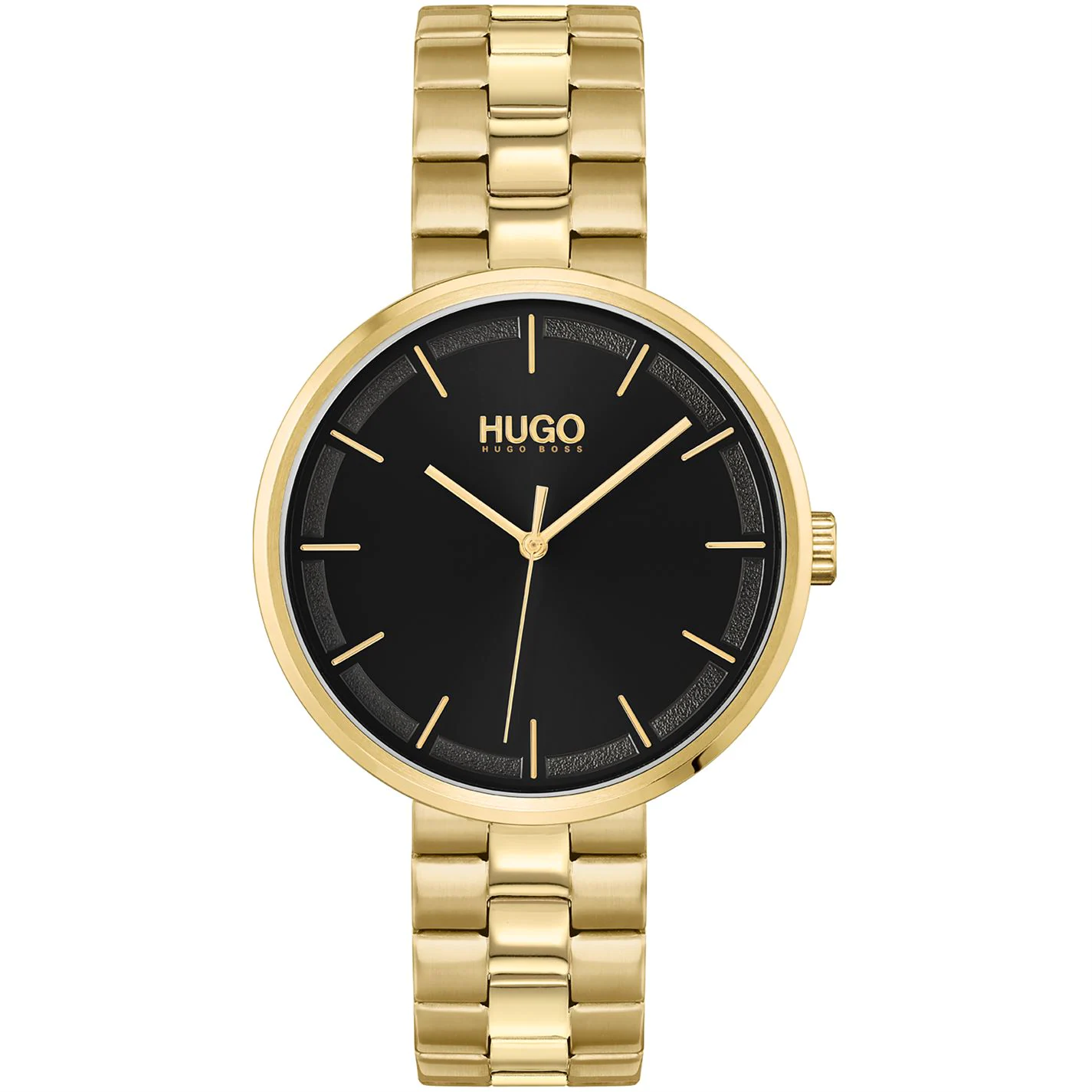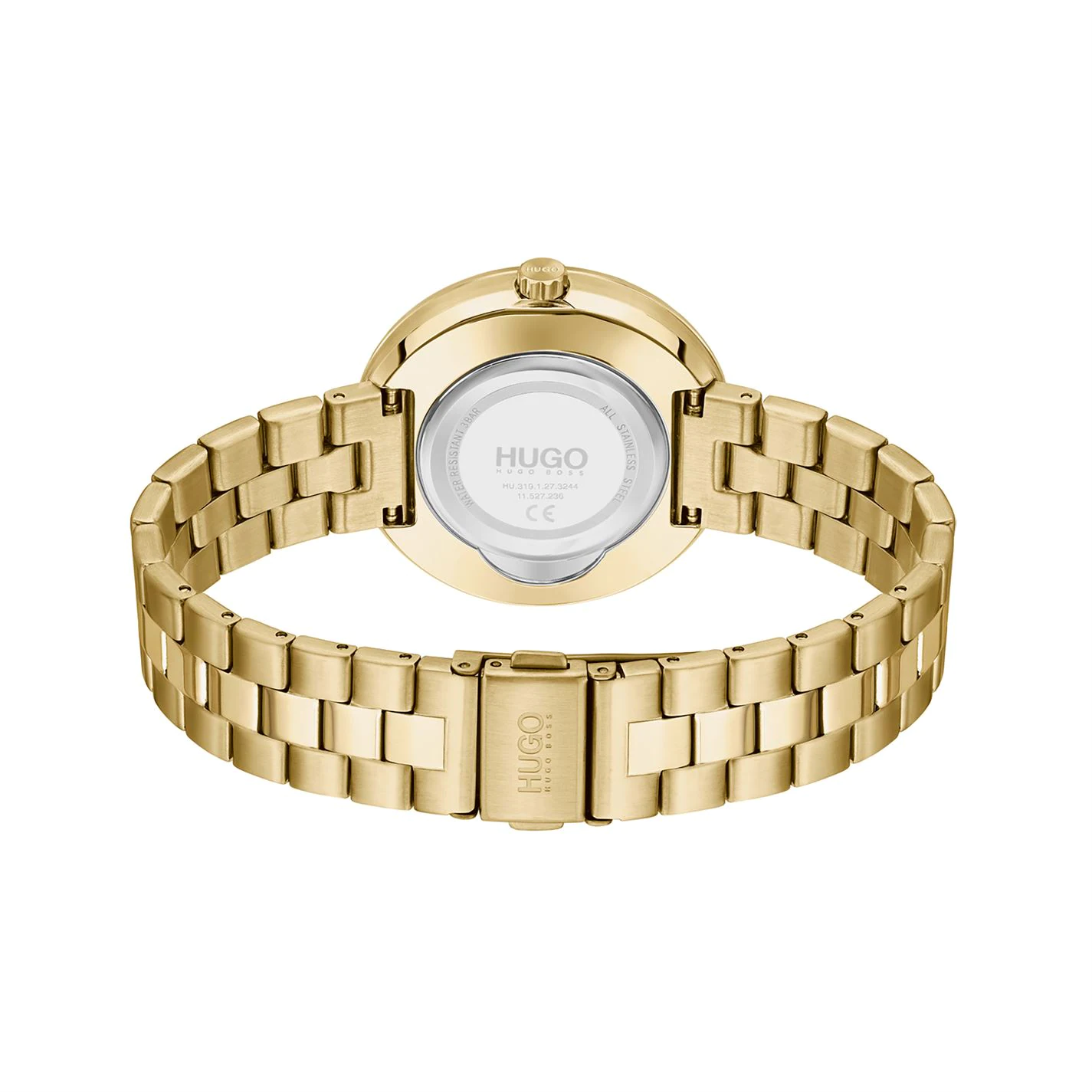 Sophistication meets contemporary cool in the #CRUSH collection from HUGO Watches. Featuring a 38mm gold IP case, black sunray dial with a sugar texture outer ring, gold IP bracelet and push button deployment. Water resistant to 3ATM