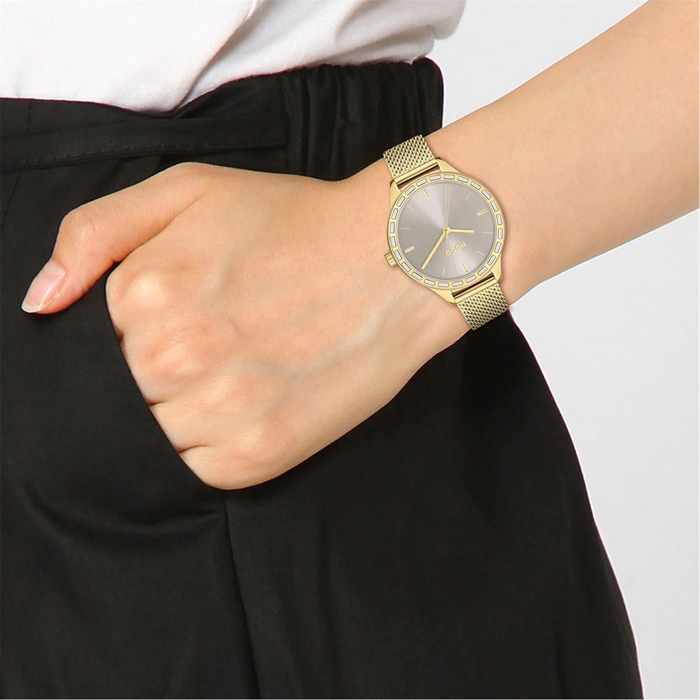 HUGO ladies watch from the #FLASH family. Featuring a 36mm light yellow gold IP case with baguette crystal bezel, warm grey sunray dial and light yellow gold IP mesh bracelet with mesh clasp. Water resistant to 3ATM