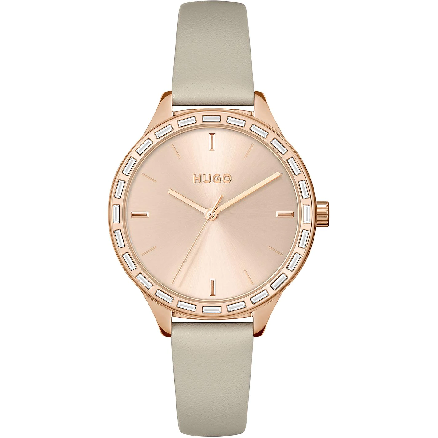 HUGO ladies watch from the #FLASH family. Featuring a 36mm case with baguette crystal bezel and sunray dial. Water resistant to 3ATM