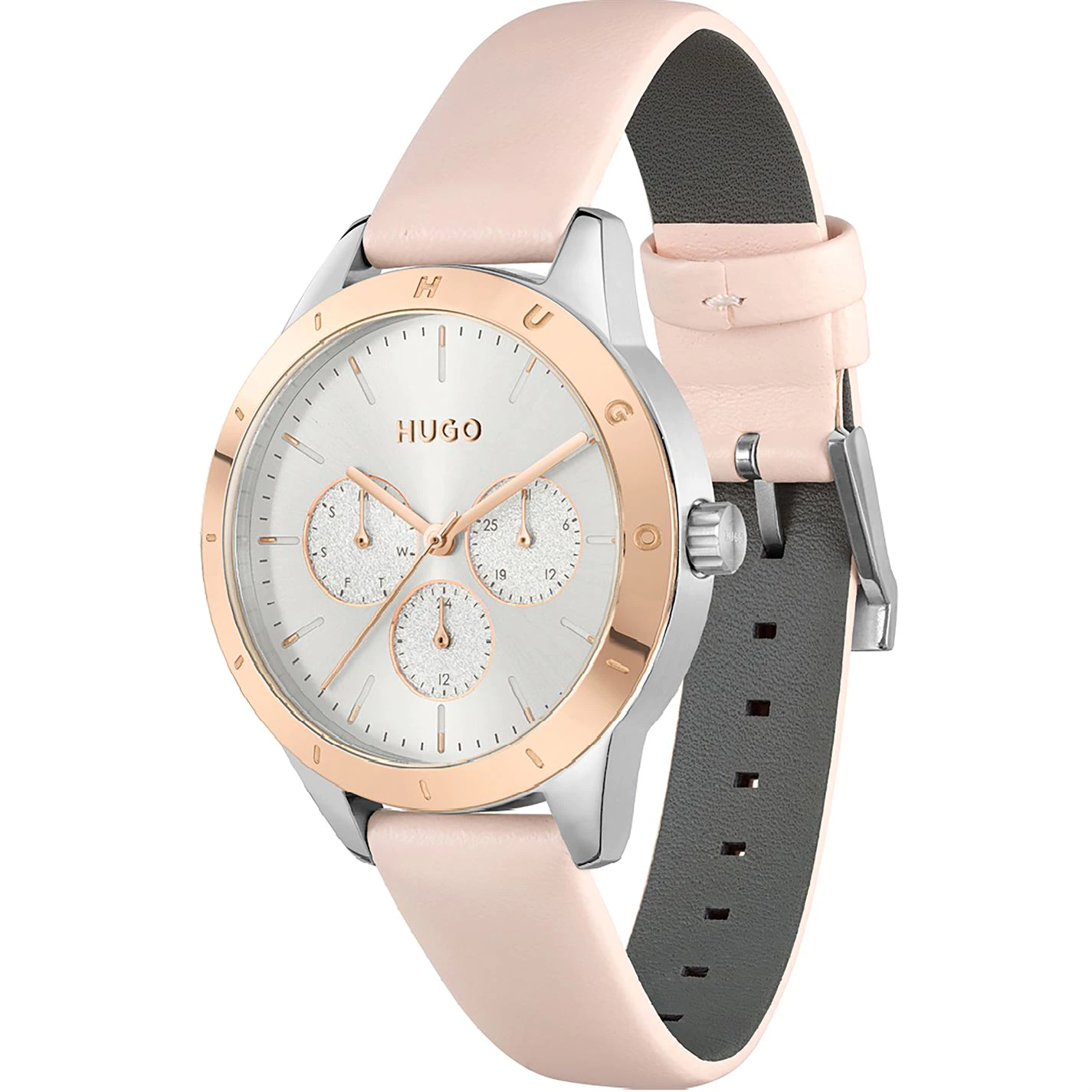 Sporty, feminine and chic. HUGO ladies watch from the #FRIEND family. Featuring a 38mm stainless steel case with carnation gold IP bezel, silver whire sunray dial and pink leather strap. Water resistant to 3ATM